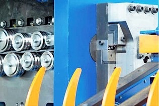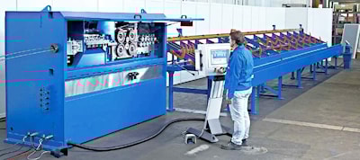 Роликовая правильно-отрезная установка Twincut 12, оснащенная накопительными ячейками для выправленных и нарезанных по размеру прутков